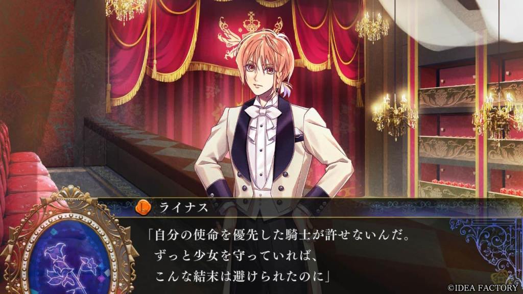 This route dives into Applause’s brother, Riley (ライリー) – which I used to translate to Larry but Riley is the official website translation… He and Lucas used to go to the same boarding school. Riley was the classic extrovert and persistently bugged the introvert until they became inseparable. They communicated in passcodes by slipping notes in a book called Blue Robin, which happens to also be the name of a mysterious organization that donates items to orphanages and under investigation for possibility of being a front for rebellion. This organization was started by Riley and Lucas. However, Riley is now “dead” so Lucas took on the burden of continuing his only friend’s legacy. Riley was clearly a siscon and showed Lucas a picture of young Applause before he left the capital (he also disclosed the true reason to Lucas). Based on this alone, Lucas was able to vibe check “Rose” at their first meeting and feel something was off. Lucas was also able to deduce Applause’s identity early on not only in his route but also other routes. He simply did not have enough loyalty to the crown to expose her.