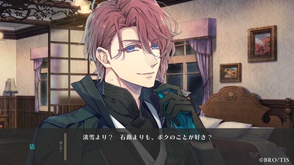 After the first two routes of Hinagiku chasing her men down and cornering them into a confession, I am happy to announce that we finally have a guy who has had feelings for her since minute 0 of the game. In Tsuyukusa’s eyes, Hinagiku can do no wrong. He gets blatantly jealous (but respects her wishes and will not coerce her/forbid her from seeing others, which is contrast to Awayuki) when she talks to others, even his twin brother Hiiragi a.k.a. Taijyu – he gets so overjoyed when Hinagiku tells them apart and gives her a big hug. He is Hinagiku’s #1 fan and also acts like a spoiled little child around her, refusing to get up at the side of the road wanting Hinagiku to hold his hand; or later requesting to rest in her lap (Hinagiku complaining about him sleeping too long to the point her legs were numb was hilarious) and thanks to that we fans get a cute CG. They also share a kabedon moment. All in all, lots of romance being narrated by one of my favourite voices of all time. So thank you writer, thank you RiRi, thank you Matsuoka, I ate good this route.