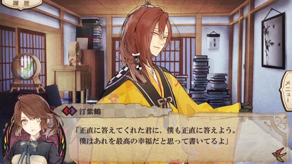 Shizuru meets Tsugumi in the main route when he was selling goldfish in the street. He enjoys flirting with women and often teases Tsugumi and makes her flustered. However, his main occupation is a famous romance novel writer. Hitaki is a huge fan of his. Shizuru often writes sensational love stories that often end with 心中 or two lovers committing suicide for each other, Romeo and Juliet style. Tsugumi has not read his works before. When she does in this route, she feels this type of writing is too “heavy” or “sad”. She discusses this with Shizuru, who tells her that he thinks this is the highest form of love.