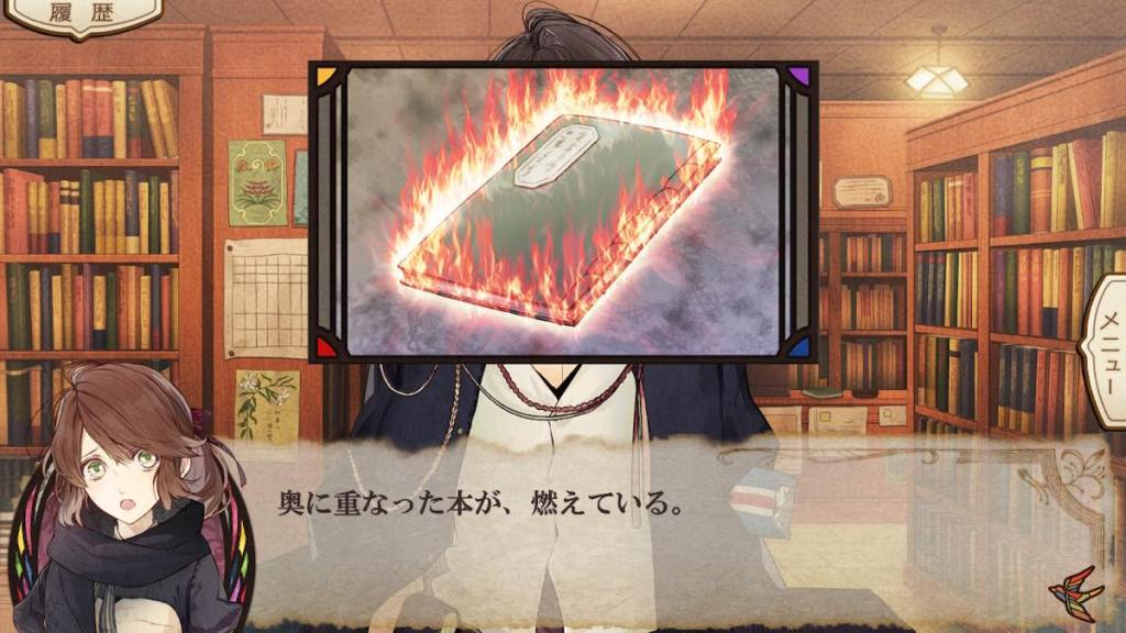 The theme of this route returns to “fire” and the book, or series of books with a fiery aura. The same one that made Hitaki want to self-immolate. Tsugumi and Hayato confiscate one of these books. It is rare for books to have the same aura. This is certainly one Tsugumi will never forget till her death.