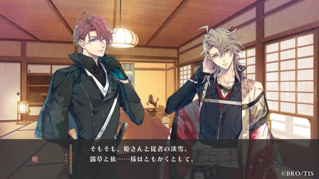 The “ghost” issue continues to be problematic. Hinagiku and co. are summoned by Hiiragi. In this route, Kagetsu/Chigaeshi clan are not cooperative with Itehari. Hiiragi says as the head of Itehari he doesn’t want to go to senka himself. However, what he can do is appoint a figurehead, with that person being Hinagiku of all people. Awayuki reverts to his old protective habits again, jumping out and rejecting the offer on his master’s behalf. And then we see probably the sassiest Hiiragi has ever been in two games combined: