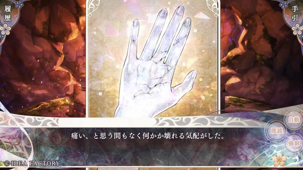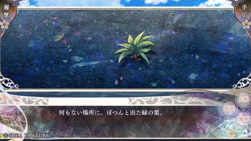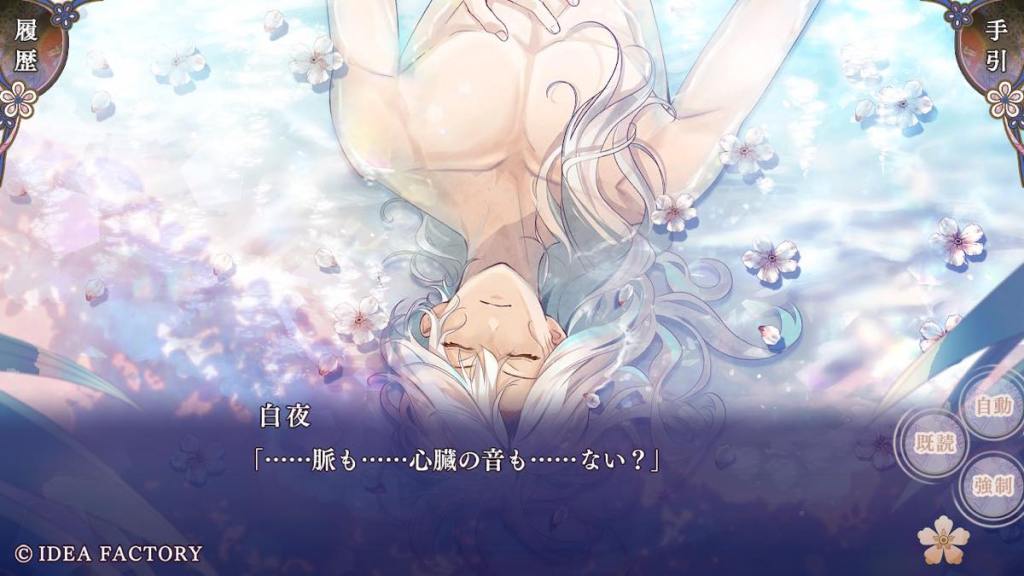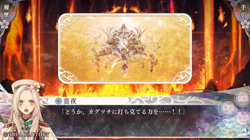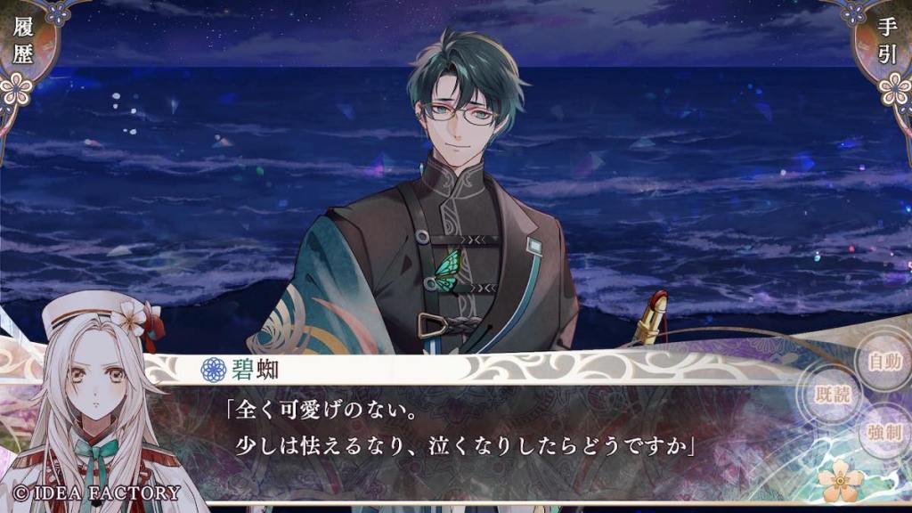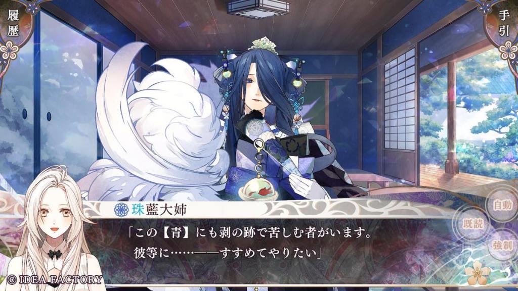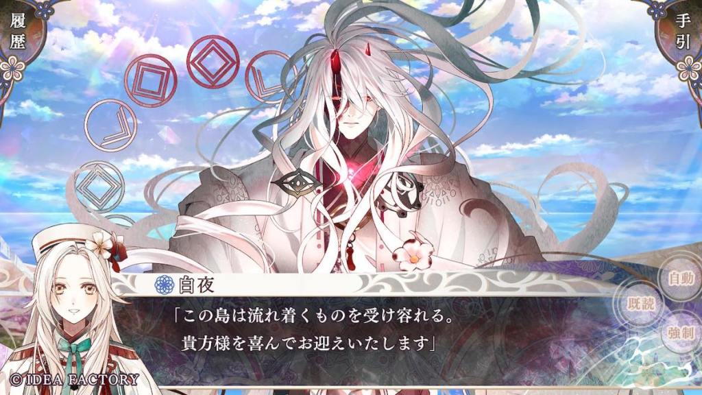 Aogumo pulls up with the execution order (again how does he even get his hands on it; it’s not a fake. I don’t even) and forces Olympia to return to Tennyo island and retrieve white crystals from her deceased clanswomen?? Souju whispers to Olympia to do as Aogumo says. Olympia returns to the island and sees Tsukuyomi who gives her the crystals, telling her that all women of white die by batsu when their time has come, per island tradition. Aogumo gets his hands on the crystals. He wants to eat them (like Baraku) because he is obsessed with turning white and acquire the power of batsu. OK why not turn into blue who are the OG users of batsu… From what Kanan (who also hates Aogumo’s ass and still just wants to see the world burn) said here and there in this route, possibly Aogumo has an obsession or “love” towards Olympia… We don’t get to learn more in this route. So far this is not the most robust writing. We also don’t need yet another guy falling in love with Olympia (you will see what I mean soon) like is she the only woman on this island… Tsukuyomi appears and warns Aogumo and Souju that people do not get away with consuming white crystals. They likely will die if they try.