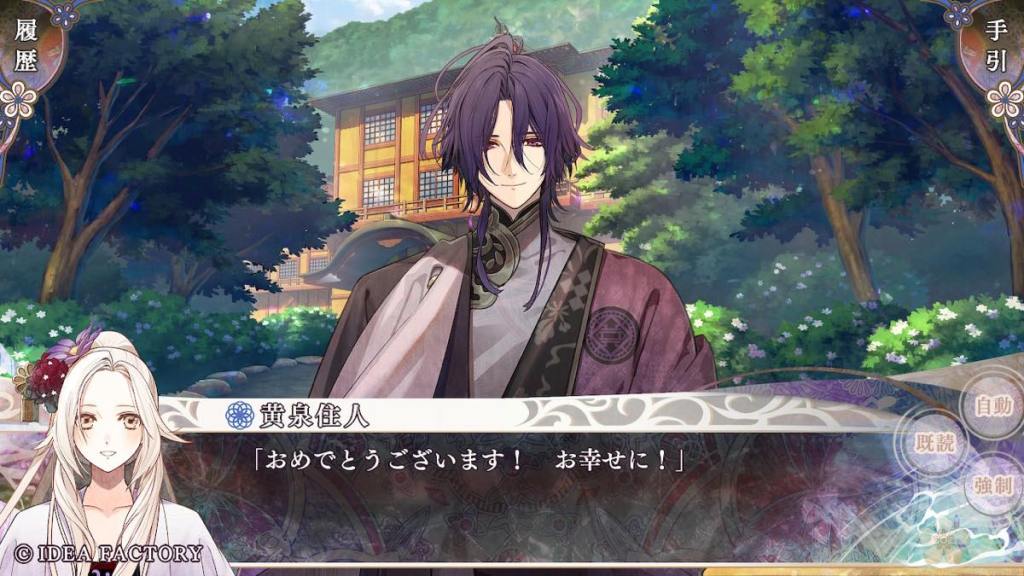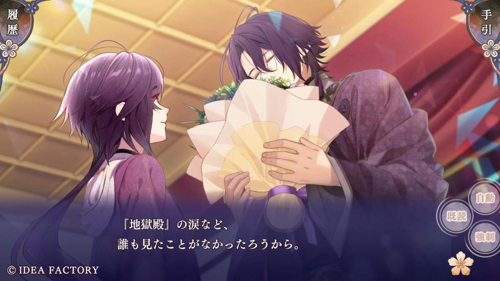 As a wedding congratulation gift, Souju gives Yosuga some special purple flowers that Shizuku grew. Yosuga starts crying because these flowers are supposedly extinct and were a symbol of the purple clan. He did not expect to see them still around in this world. Wow we got to see Yosuga get angry, beat people up, and cry in this route. Many firsts.