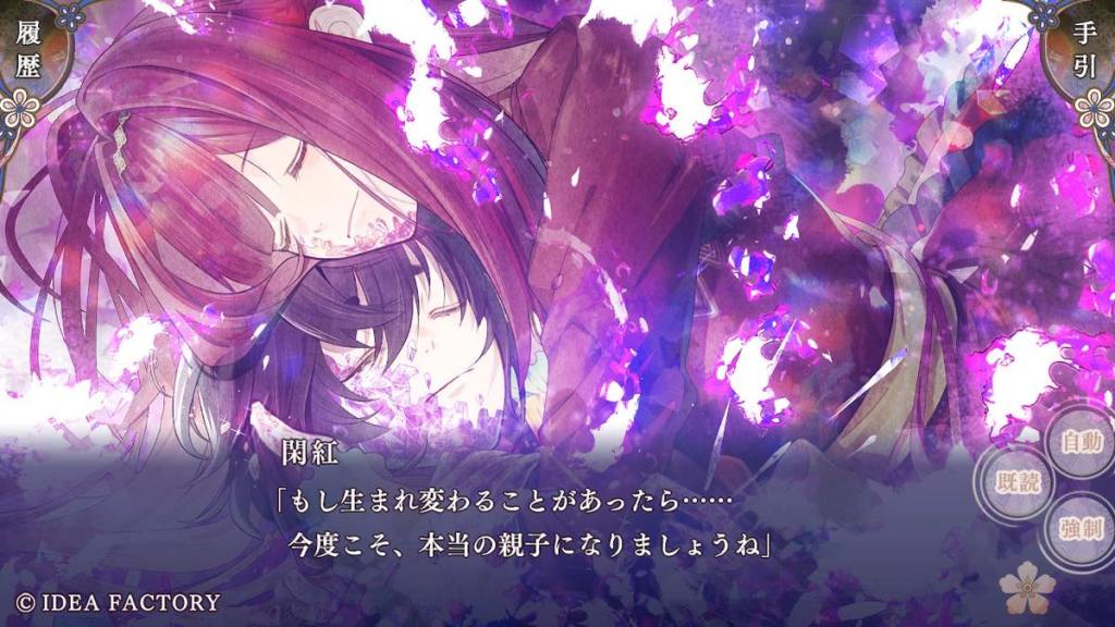 This conflict is presented directly to Tokisada as a woman from his clan, Nishikigi, gives birth to a “colourless” son and flees the clan knowing the child would be taken away forcibly from her to Yomi, and separated forever. She begs Tokisada to banish her as well so she can stay with her child. This is considered an unorthodox decision, but Tokisada sided with the mother/child and hid them instead of banishing them, and faced tremendous pressure within the court and in public. Eventually, Shizuku (who is infertile herself, has an adoptive son Souju who is clearly of the purple clan that is supposedly extinct other than Yosuga – perhaps more in Yosuga route) from the “red purple” (I can’t every time the people in game pronounce it as the “sexy” clan… I can’t be the only one…) has graciously agreed to take in Nishikigi and her child.