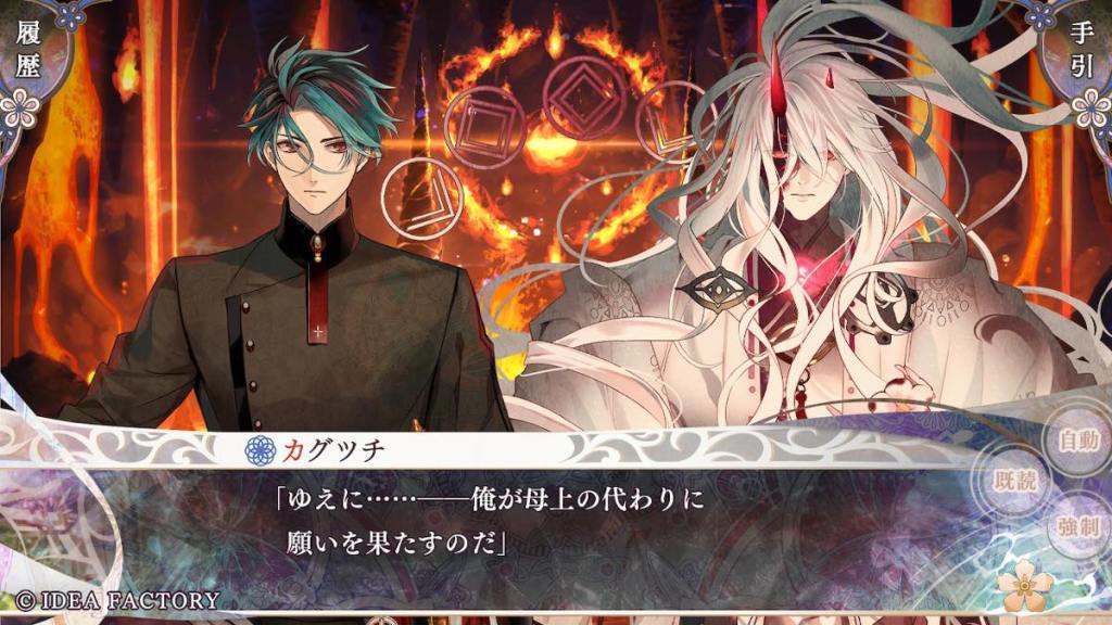 The other major conflict this route is Riku meeting his birth mother, Tomori, who signed a contract at his birth giving him up to the “blue” clan and never revealing her identity to him. However, the two were attracted to each other in a familial sense from their meeting. I especially love the detail where Tomori likes to make hamburgers for the children in Yomi, and we all know what Riku’s favourite food is haha.