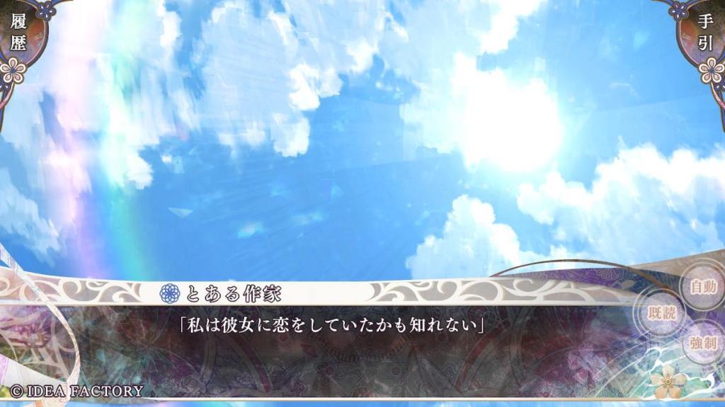 The story of this route revolves around Nathanael, or rather, whoever is under Nathanael’s skin. On the surface, he seems like a refined, timid person of education and status. However, at times he continues to let the mask slip. When he is Nathanael/Sutoku, he uses watashi to refer to himself, but when he is ??? he uses ore. Olympia also encourages people to call him Aki, which is the name he remembers [Sutoku’s posthumous name is Akihito], instead of Nathanael, the lover to Olympia in the story – this was a twisted idea of Aogumo’s which was explored in Himuka’s route: he desired Olympia, but felt not worthy of her, hence wanted to live through “Nathanael” to fall in love and destroy “Olympia” like the story.