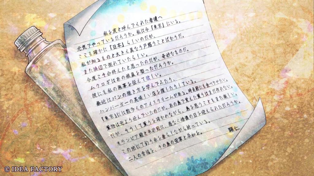 Akaza and Olympia ask Tsukuyomi on how to talk to Susanoo and ask him why he let someone like Aki, who at times wants to destroy the island, through. Tsukuyomi says there is no other way other than to let Susanoo awaken within Akaza himself, as Susanoo is just a soul without flesh. The two go to seaside and yell at Susanoo, who does not answer but washes a little bottle on shore. The bottle contains a letter from the girl in Tokyo that was Olympia’s penpal in the first game.