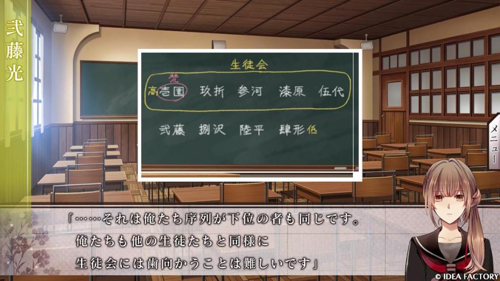 Mitsu is the student who fought on behalf of Hiroka during her first fight with Tomoe. He claims he is her “prince” that arrives “dashingly to save the day”. Mitsu is a friendly, bright, courageous ray of sunshine who stands for everything nice and good in this world. To him, being a “prince” or “hero” like in the fairy tales he grew up listening to is important, and he can’t stand by and just watch those who are in need, even if he ends up paying the price, such as when he defends Hiroka against Meguru’s tyranny and gets assigned more labour. Given his reactions in other routes, he likely has a crush on Hiroka since he first saw her.