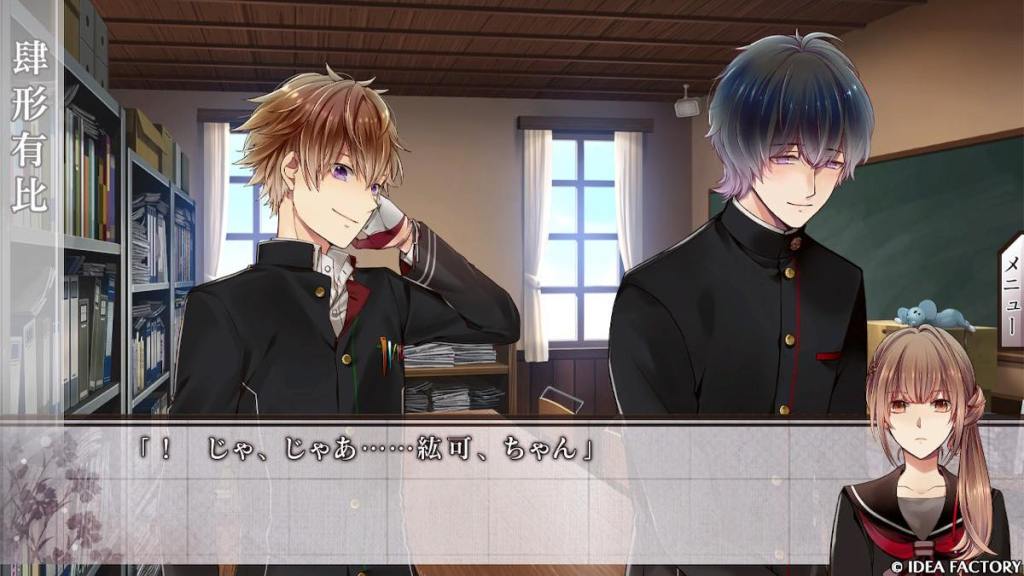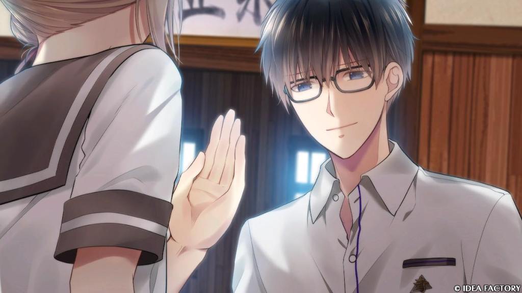Hiroka sees Godai Tomoe (voiced by Takahashi Hiroki btw, not romanceable) of the “fifth” family bullying Shikata Yuuhi of the “fourth” family in the name of “inquisition” on behalf of the school council. She stands up to Tomoe and suddenly, the kanji “zero” is burned onto her left hand.
