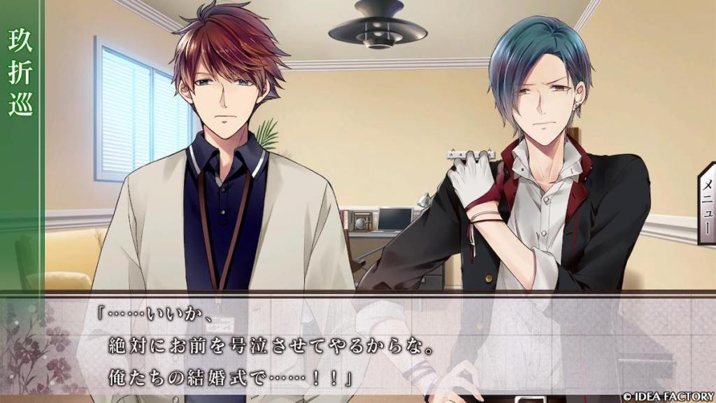 As Hiroka is about to be stabbed, Meguru appears and takes the hit for her. This wakes up Ousuke, who realizes his wrongdoings and is put on probation as a result. Meguru is hospitalized but fortunately is recovering. Hiroka visits him. He tells Hiroka that he is jealous she calls Yatsugu by his name, even if he is her guardian. He tells Hiroka that her place is beside his, that he loves her and wants to make her happy. The route ends with a kiss.