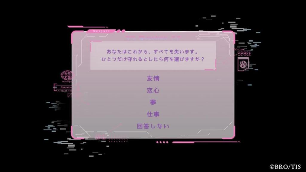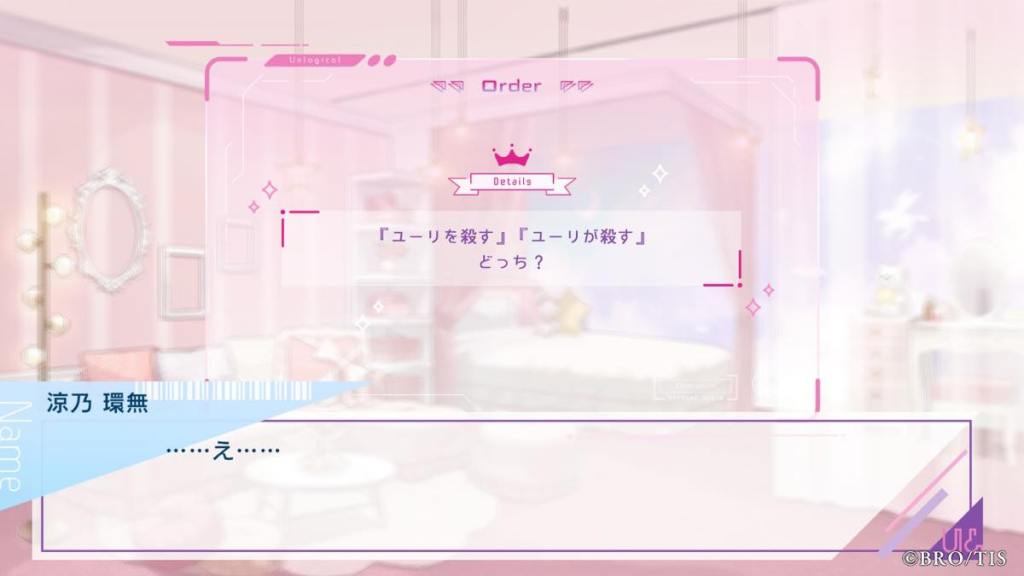 The date is October 8. Suzuno Kanna gets a video call from Nagamori Ran inquiring on her progress regarding the next piece of music they are producing together. Ran is Kanna’s best friend and her collaborating partner in the virtual music project Latria. Ran receives an email inviting him to join a VR project called UN:LOGICAL. Both of them think it’s a scam so Ran doesn’t bother responding. Meanwhile, Kanna learns she has been dumped over text by her boyfriend, Munakata Kai.