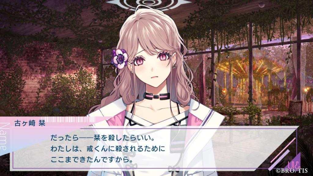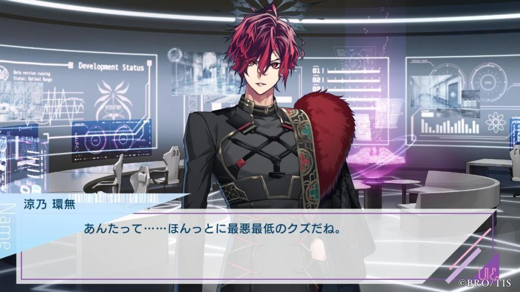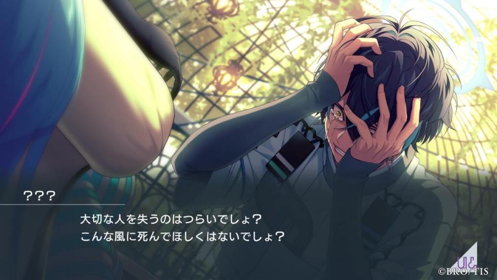 From the previous routes, Miyabi is portrayed to be a sociopathic person who is only focused on developing the game. He claims the game’s goal is to “elicit strong emotions” from participants and does not seem to have the capability to show or comprehend emotion himself. He does not understand why Kanna is so intent on saving people in-game, even after the initial “incidents” after stage. To him, Kanna is wasting time trying to save people she doesn’t even know; people who joined the game willingly even after their comrades died, and may not even want to be saved. He continues to coerce Kanna to stay as an operator in order to stay in contact with Ran, who claims he stayed voluntarily in game because he “messed up” something and need to stay to fix some bugs.