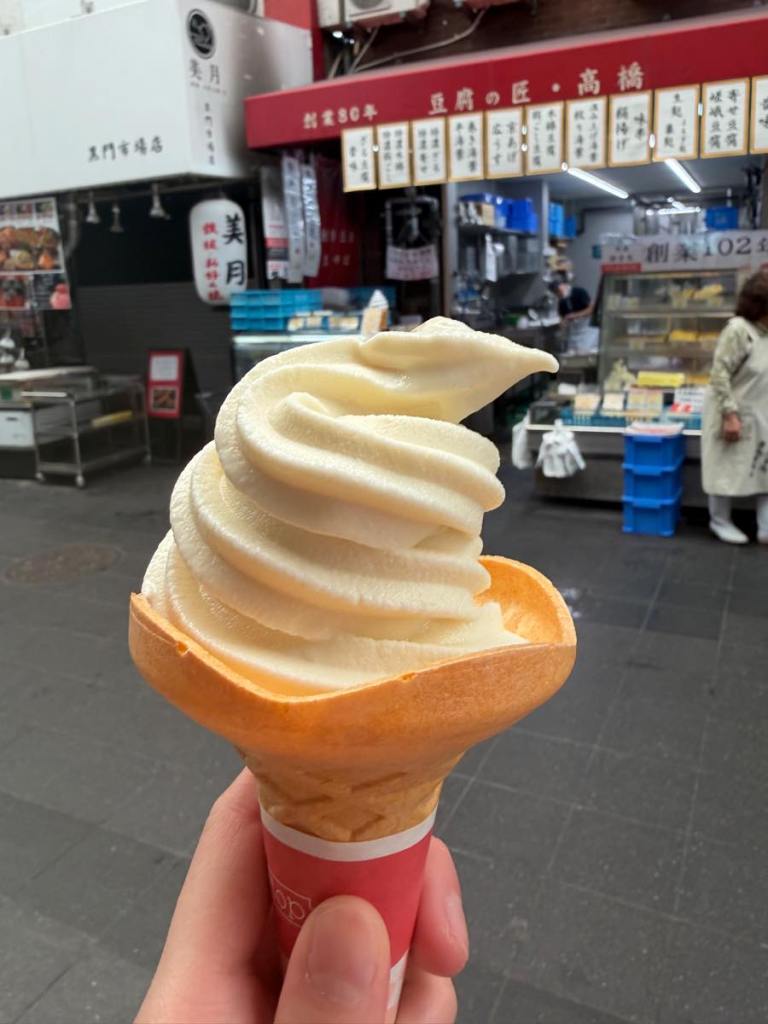 My first stop of the day was Takahashi foods – this is a humble stand situated in Kuromon market featuring a family business that has run for just over 100 years focusing on soy milk, tofu, and related products. I got the soy-milk ice cream or “soft serve”. The shop owner lady was very friendly. We had a little chat in Japanese – in the end I told her I was from Canada and she let out a big ehhh?! as she wasn’t expecting this at all.