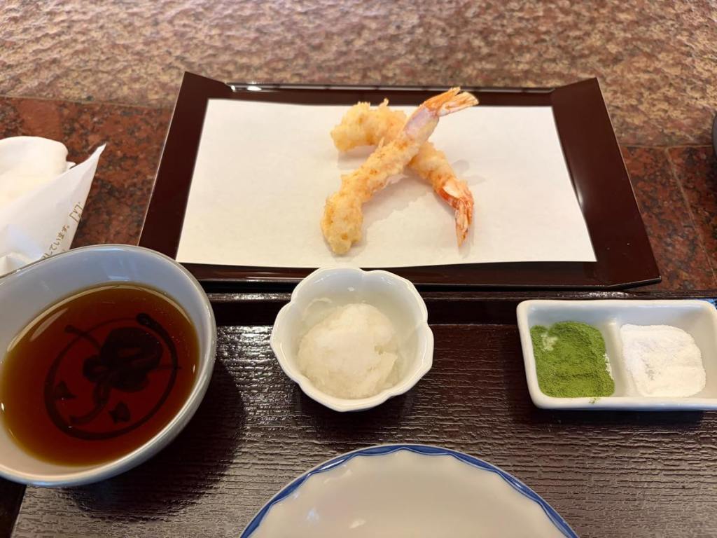 left to right: tentsuyu, radish salad, match salt!, and normal salt. The chef will recommend what to go with for each dish.