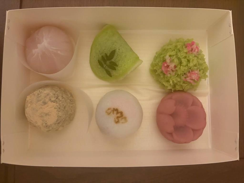 I called 1-2 weeks before I departed. He was very considerate and slowed down his speaking for me as well as triple checked the details. He trusted me and took my first name only and Kyoto hotel number, then said 火曜日に作ってるから、必ず来てくださいね。He also told me ちゃんと伝わったから、もっと自信を持っていいよ!which was so kind. Anyways, I showed up at 4:30 PM on the Tuesday we agreed on and picked up my sweets! I had them back in my hotel with green tea as dessert after my dinner; placed it in the fridge prior to that. I asked for one piece of kinton (their specialty, top right) & five omakase. My favourite in terms of taste actually ending up being the one with sakura filling on the top left!